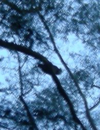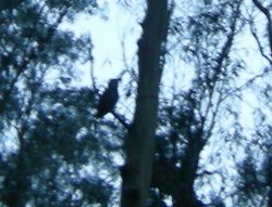 And then, along a darkening trail, we saw them: A pair, in two different trees, talking quietly to each other. A flash would have been an intrusion as lurking humans are not. So here are the flashless photos. These are the birds Nature-In-the-City wants gone.