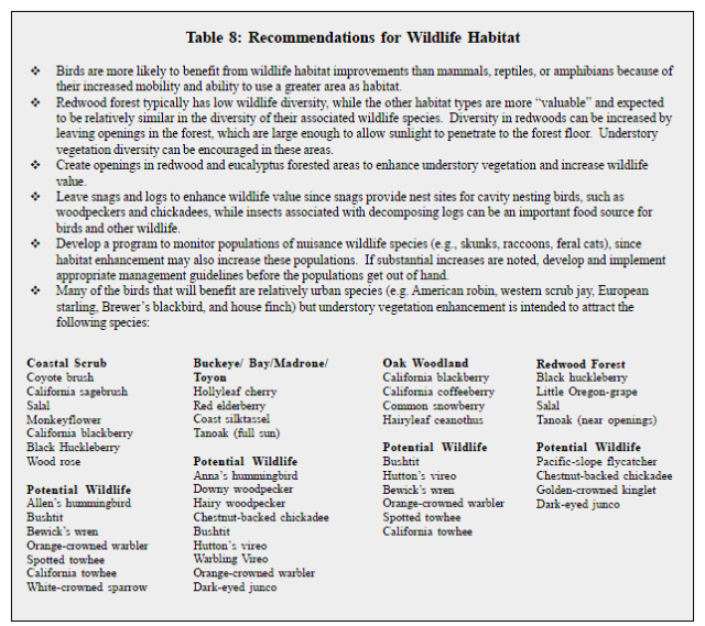 This Plan doesn’t even give habitat issues a passing mention. But according to the 2001 plan, “birds are more likely to benefit from wildlife habitat improvements than mammals, reptiles and amphibians…” Then it goes on to say, “Many of the birds that will benefit are relatively urban species (e.g. American Robin, western scrub jay, European starling, Brewer’s blackbird, and house finch) but understory vegetation is intended to attract the following species…” Here it lists 16 species. But most of those (possibly all) already frequent the forest.