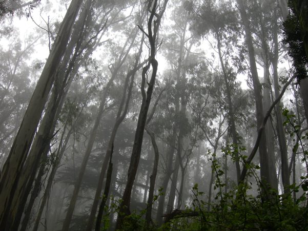One day, as I followed the trail, I came upon a very old lady, dressed in black, and holding a cane. She was sprightly and chatty. She told me that she had lived in the neighborhood for eighty years. Her name was Eileen Coffee. She could recall when the trail had been used as a bridle trail. Now, she felt it was good exercise for her to walk from her home near Clarendon to the UCSF campus where she took an exercise class and went swimming, three times a week. I saw her several times over the next year or two – and then not again. I used to think, “Some day I will be like her, still walking in the foggy forest. Still loving it.