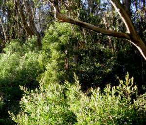 This tree occurs naturally as an understorey tree in the wet eucalyptus forests of Australia, and so it does here, too, in Sutro Forest, where it forms the sub-canopy in some areas. It tolerates a wide range of conditions, including fog and wind.
