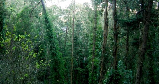 The forest, though it includes around 100 species of plants, is dominated by a few trees and bushes that form its habitat. The trees are eucalyptus in the canopy, with acacia in the sub-canopy in many places. The understory is blackberry bramble (both California and Himalayan) with a mixture of smaller plants. (Many natural forests are based on one or two dominant species. Redwood forests. Oak-bay forests. Pine forests. ) Vines – primarily ivies – climb the tree trunks, but seldom reach the canopy of the trees.