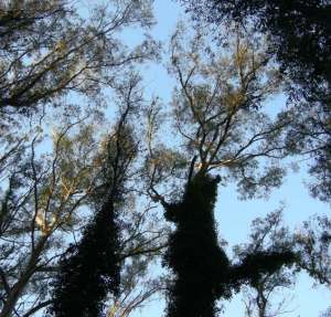 - The eucalyptus is flexible at the top. We’ve all seen how the tops of eucalyptus wave in the wind like great green fans. University of Florida’s Francis Putz notes that in a study he did in Panama, “Trees of predominantly liana-free species were more flexible and had longer leaves…” Is a similar effect at work here, with the movement making it more difficult for the vines to grab hold?