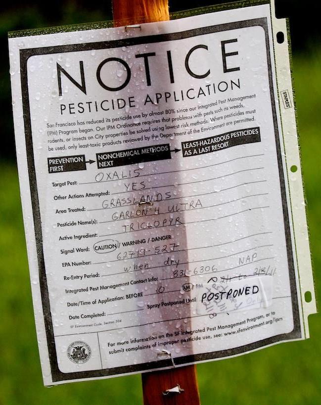 We’ve been observing the issue of pesticides at Glen Canyon Park at a remove; but here’s what we understand. The place falls under the Natural Areas Program (NAP), which plans to use Garlon, one of the most toxic herbicides San Francisco permits, to attempt to get rid of oxalis, theoretically to benefit native plants. Garlon works on broad-leafed plants, but not on grasses or iris or conifers.