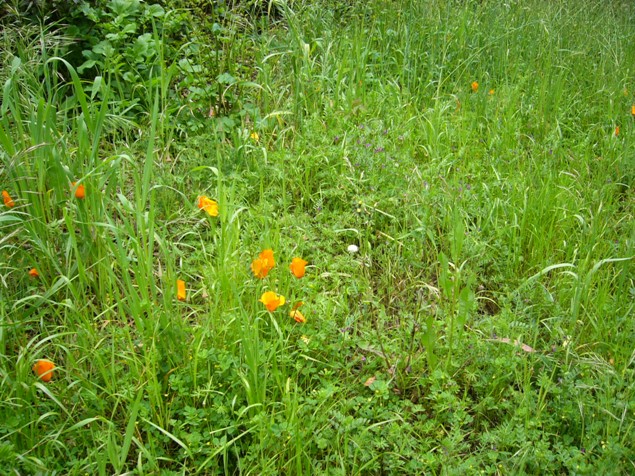 We saw a few Douglas iris here and there, and some California poppies and scattered lupines in the Native Garden. And miner’s lettuce, also blooming in tiny white flowers over saucer-shaped leaves. The Native garden is green and lush now, except for the area where the meadow’s being replanted. This is a good time to go look at it; in a couple of months, much of it will be dry and brown.