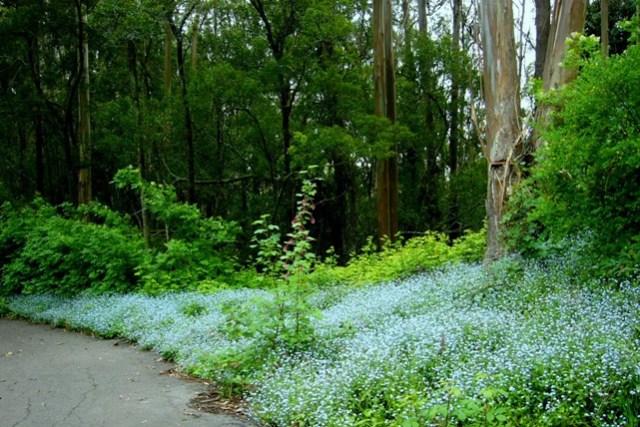 But in places where the blackberry has been mown down, forget-me-nots line the trail. It’s some consolation, though it doesn’t compensate the birds. The beautiful display of them just before the entrance to the Native Garden is as lovely as last year’s.