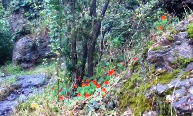 You can’t miss the nasturtiums, their brilliant orange color luminescent in the fog. They’re blooming all along the Fairy Gates trail, and just below Medical Center Way.