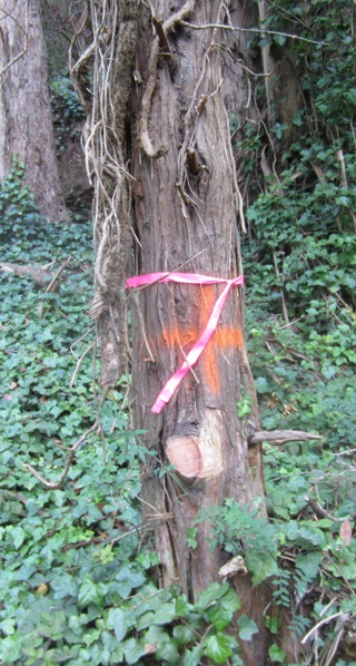 Along the Stanyan Trail, we saw a number of trees splashed with orange paint and/or tied with pink tape. We suspect these are marked for destruction, adding to the toll of downed trees on the “Kill Trees Trail.”