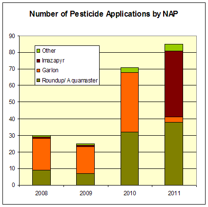 The big change this year was the move from Garlon (triclopyr) to Polaris or Habitat (imazapyr). According to the record, Garlon was only used thrice in 2011, while imazapyr was used 40 times.