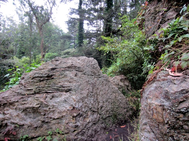 The Native Garden on the summit was, predictably, dry. It’s also within the fog belt, but has no tall trees to harvest the cloud-moisture, and little undergrowth to retain it. (The green bushes behind are non-native acacias.) The newly replanted meadow was all brown grass and plastic flags, with a few California poppies. But as soon as you leave the Native garden and enter the forest, it’s damp again.