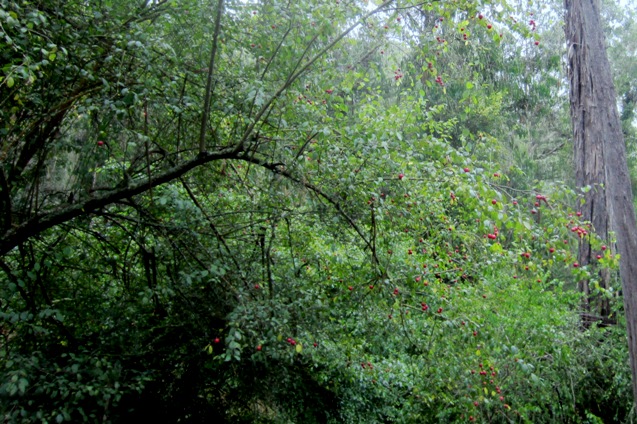 This part of the forest has many plum trees, heavy now with small red fruit. (We’d mistaken them for cherries, earlier; they’re about the same size.) My companion reached up for a few. “Are they okay?” I asked. I knew UCSF uses no pesticide on the mountain, so that was okay, but I didn’t know how they tasted.