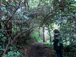 Elsewhere in the garden, a mock-orange was covered with little white flowers. A few oak trees, sheltered from the wind by the forest, have gotten a foothold. Planted some years ago, they are still small compared with the blackwood acacia and the tall eucalyptus. The new notice-board looks bulky beside them, but unlike their tragic counterparts in Tank Hill, they actually are growing into trees. (Despite numerous attempts, Tank Hill still has no oak trees – just some sad saplings not even three feet tall.)