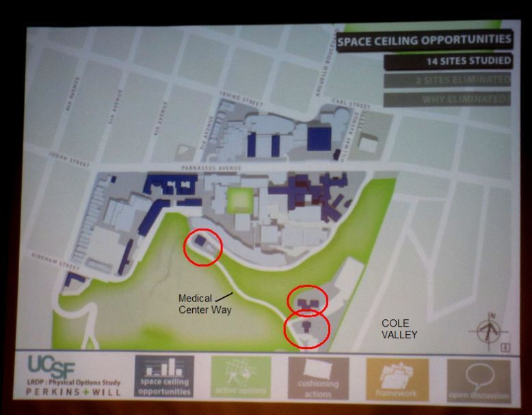 In the forest, three small buildings may be demolished to help free up space ceiling limits: The office buildings at the Woods Parking lot, the Surge Parking Lot, and the elbow of Medical Center Way. (They’re the ones in red circle in this map.) The plan would be to return them to Open Space. In our break-out group, we questioned what that might mean, and pointed out that UCSF had undertaken to return an area under a demolished dormitory to Open Space by planting it to blend in with the forest. Instead, UCSF converted it into a chain-link-fenced Native Plant Nursery. (That story is HERE.) This raises questions both about the definition of Open Space, as well as accountability should UCSF just change its mind.