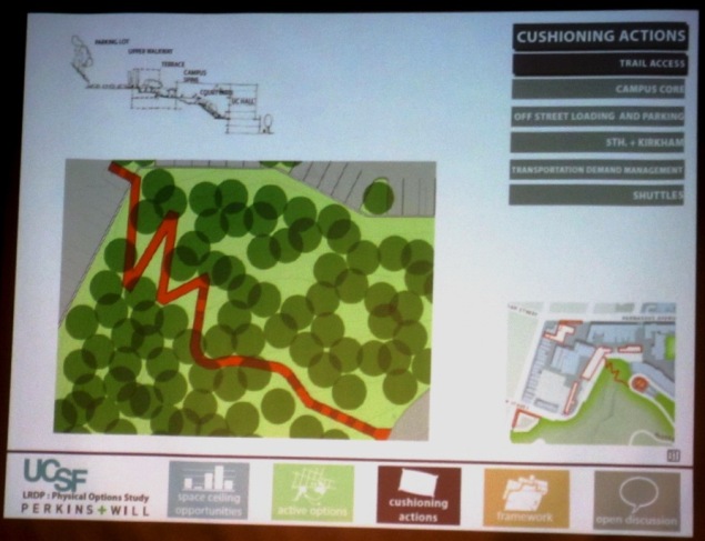 A trail is planned to join the campus with Medical Center Way. (This trail was discussed in the context of the EIR scoping meetings.) While we have no problem with the trail as such, we are concerned about how many trees it would kill. Our experience with the Kill-Trees trail built in the Interior Greenbelt part of the forest was that it cost us over 50 trees, a number not disclosed in any of the prior meetings. [Edited to Add: That story is HERE. We should clarify that the Interior Greenbelt is owned by the City, not by UCSF; but our concerns remain.]