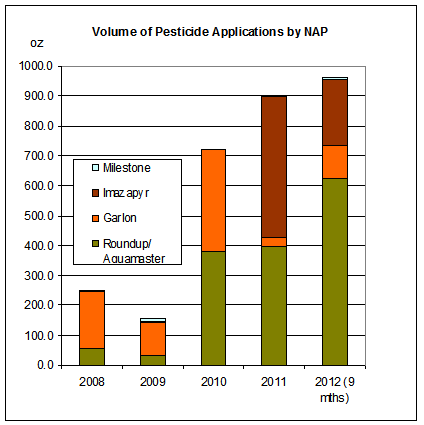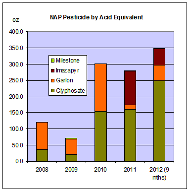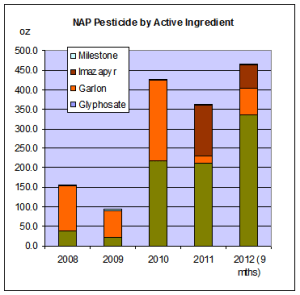 So we obtained the pesticide reports every few months, and compiled them. In September 2012, the Natural Areas Program’s nine-month pesticide use surpassed 2011’s full year usage by every measure.