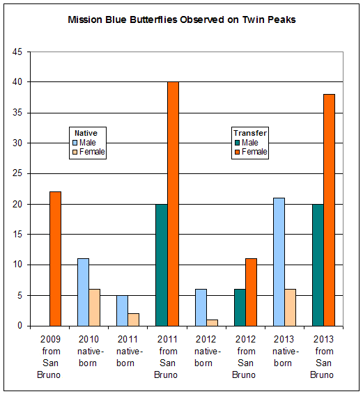 There’s better news in 2013’s crop. They spotted the largest number of Mission Blue eggs ever: 1170 of them. They also saw 27 native-born adult butterflies, 6 females and 21 males, prior to moving in another 58 butterflies from San Bruno mountain – 38 females and 20 males.