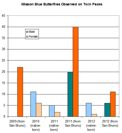 Regular readers of this website know that we’ve been following the Natural Areas Programs attempts to reintroduce the Mission Blue Butterfly to Twin Peaks. We’ve just obtained the latest report from San Francisco Recreation and Parks Dept (SFRPD). It’s very mixed.