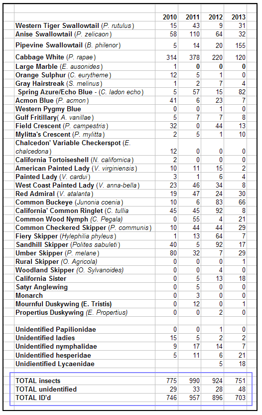 The top three butterflies of 2013 were the Pipevine Swallowtail, the Cabbage White, and the Echo Blue, AKA the Spring Azure, and they accounted for just over half the identified butterflies. (There were a few that were id’d by family but not species.)