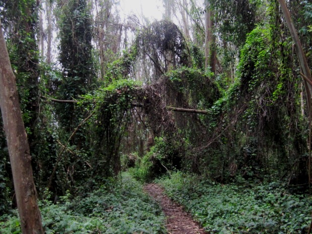 Like this one that ducks under a tree that fell, but like most of Sutro Forest’s falling trees, never made it to the ground. Other trees catch them instead.