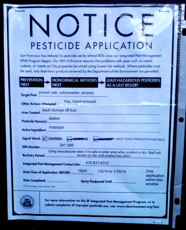 Even as we celebrate UCSF’s decision not to use pesticides in Sutro Forest, we’re reminded that the section of the forest above Cole Valley is managed by San Francisco Recreation and Parks Department (SF RPD) and falls under the misnamed Natural Areas Program (NAP). That area is not spared toxic herbicides, as we saw when a pesticide notice went up there for the first time since 2010.
