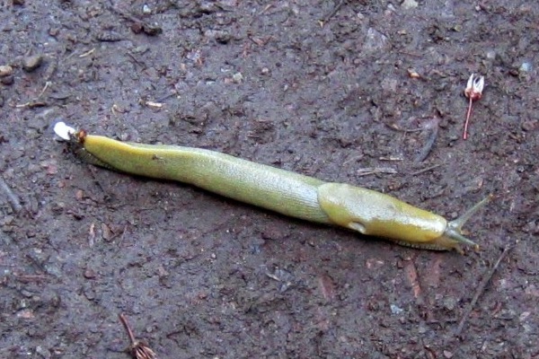 The damp trail conditions encouraged this little critter to cross the trail. We watched as it made its sluggish way, a plum petal stuck to its butt.