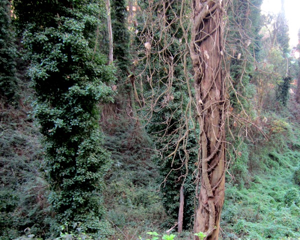 Everywhere along the trail, we saw trees festooned in the brown skeletons of dead ivy. The vines, thick as a human wrist, had been cut through and left to die. The fear is that the ivy kills the trees, but according to Jim Clark of Hort Science, there’s no evidence that it does. Vines can hurt trees in three ways; by covering their canopies, so they don’t get enough light for photosynthesis; by girdling the trees by twisting tightly around it; and by increasing its vulnerability to the wind through the “sail effect.”
