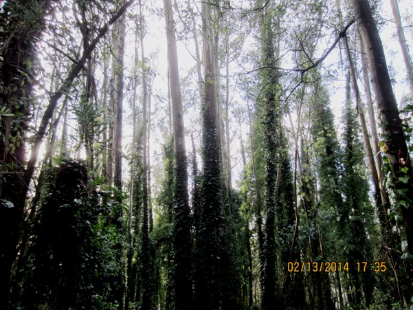 In fact, Jim Clark says, the ivy doesn’t get into the canopy of the trees; and that’s borne out by what we’ve seen in the forest. The ivy gets up the column of the tree, and it stops and flowers – providing excellent habitat and food supply to insects and birds. It also doesn’t circle the tree; it tends to travel straight up as is evident from the picture above. And in forest conditions, it actually helps slow the wind, and so all the ivy-bearing trees protect each other.