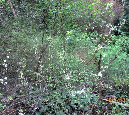 A damp trail led past a stand of plum trees, still blooming prettily.