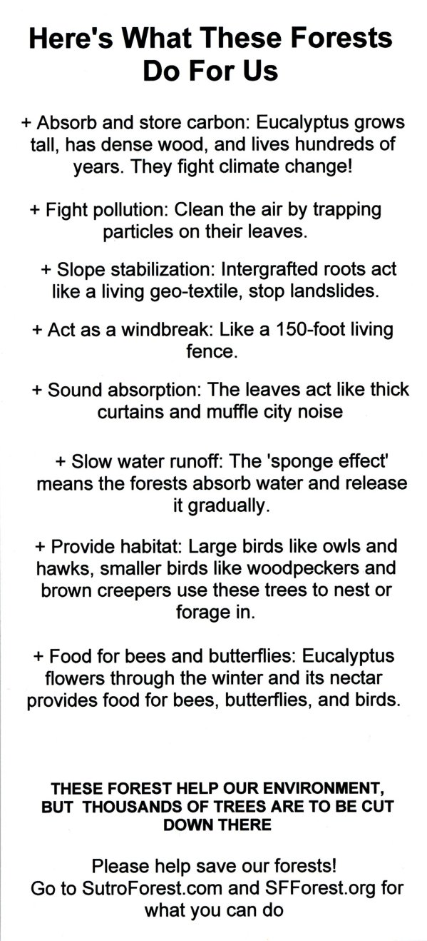 + UCSF held off on cutting down the white-dotted trees in Sutro Forest, which could have happened by now. They say they are going to review the trees carefully and only remove those that are actually a hazard.