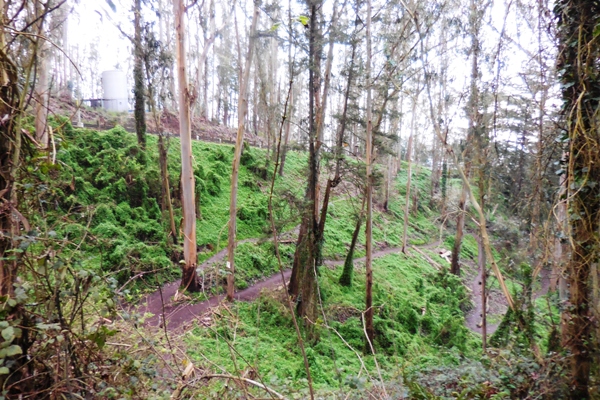 The forest is beautiful, especially on foggy or cloudy days. But there’s no denying that some parts of it have been damaged by the tree-felling that’s occurred in 2013 and 2014, and the massive removal of understory vegetation. The area in the picture below got a double-whammy – the area above Medical Center Way road had understory and many trees removed for “fire safety” work around the now-very-visible water-tank; and below the road, many large trees were removed as ‘hazardous’ even if they actually posed no real threat.