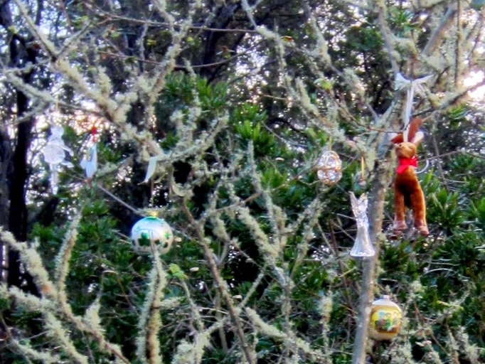 ornaments in dying tree in Sutro Forest Native Garden