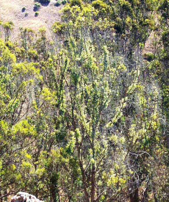 Mr Sigg describes “how to identify a dying blue gum” as follows: “Look for trees with thinning foliage and copious juvenile leaves (called coppice shoots) hugging the main stems. These coppice shoots are easy to see because of their blue color and tight clustering, as opposed to the adult leaves, which are 6-8 inches-long, dull-olive-colored and sickle-shaped and which hang from the ends of long branches. These coppice shoots are the give-away that the tree is in trouble and is destined to die soon…” (He later corrected “coppice shoots” to epicormic growth.)