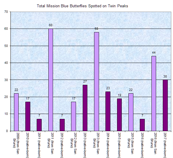 The first batch, 22 females, was brought over in 2009. Optimistically, they hoped that this would be sufficient. But in 2010, only 17 butterflies were spotted, and imports resumed in 2011 – and in 2012, 2013, 2015, and 2016. In the graph below (covering the years 2009-2017) the dark bars show the “native-born” butterflies on Twin Peaks – i.e. ones that were spotted before transfers from San Bruno, or in years when there were no transfers. The light bars show the butterflies imported to Twin Peaks. In 2017, they’ve spotted 30 native-born butterflies.