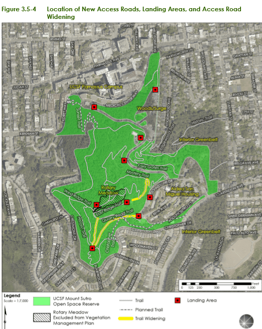 But it’s not just the tree-cutting. UCSF is widening two major trails into roads fit for heavy equipment, and adding nine quarter-acre “staging areas” for machines and felled trees. Both the roads are above Forest Knolls. (The heavy yellow lines in the map below are the new roads. The red squares are the locations of the staging areas, each of which will be a quarter acre.)