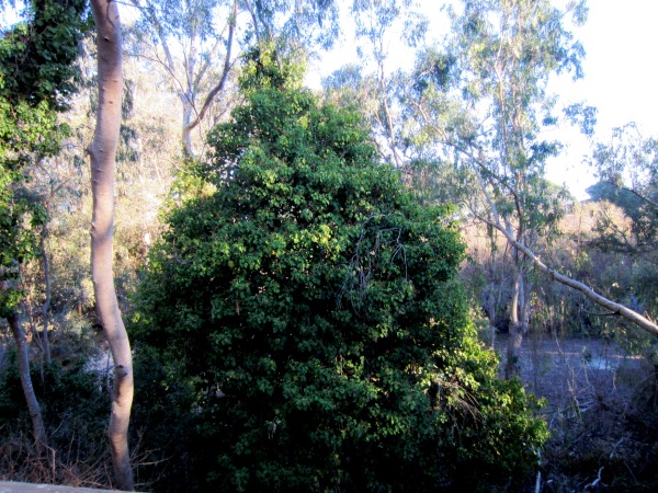 We’d read that Monarchs might feed from eucalyptus flowers, which provide a winter resource to so much wildlife. That proved to be true. Looking through binoculars, we saw the eucalyptus flowers far overhead were full of butterflies.